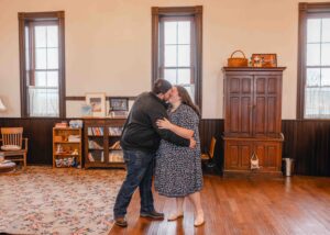 The extreme winds we are experiencing in Ohio today have me reflecting back on Maggie and Liam’s windy winter engagement session. Despite the chilly weather for January, we found the perfect cozy escape: her mother’s charming writing studio! This space was filled with so much charm and warmth, it was the perfect setting for their session!